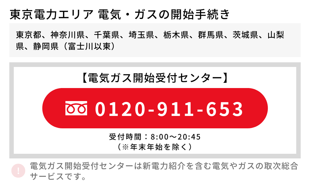 | 受付窓口 | 電気ガス開始受付センター |