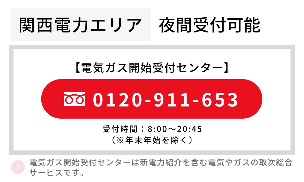夜間の電気開通や強制解約に伴う再契約は、電気ガス開始受付センター(0120-911-653)でも受付可能です。
