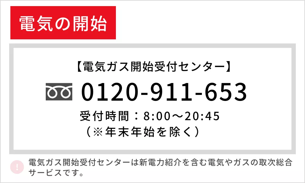 また、引っ越しに伴う電気・ガス・ネットの開通は電気ガス開始受付センター(0120-911-653)でも手続きできます。電気ガス開始受付センターは新電力紹介を含む電気やガスの取次総合窓口です。まとめて手続きすることも可能なため、お急ぎの方はぜひご活用ください。