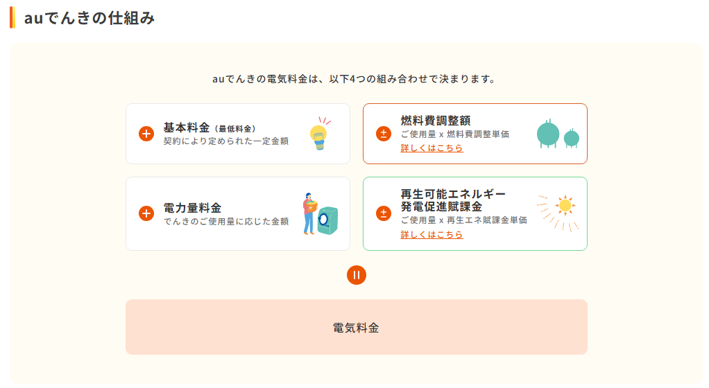 auでんきの月々の請求額は、「基本料金(最低料金)」「電力量料金」「燃料調整額」「再生可能エネルギー 発電促進賦課金」の4つの要素で構成されています。